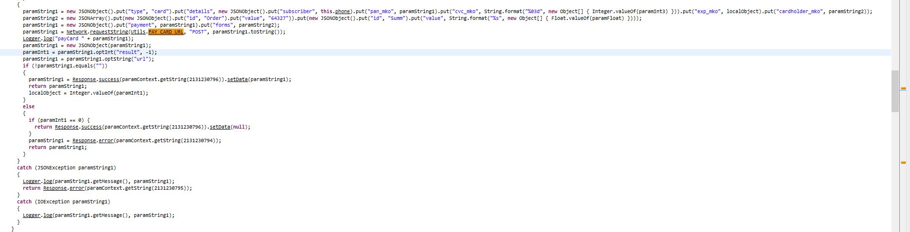 UPD: в связи с ошибками декомпилятора у некоторых читателей возникли вполне обоснованные сомнения в моей компетентности. Выкладываю результаты правильной декомпиляции. Ошибочные сохраняю под спойлером для понимания разночтений в оценках. Отдельно добавлю что сниф трафика показывает, что обращения на gorms.mobi идут постоянно с момента захода в меню оплаты.