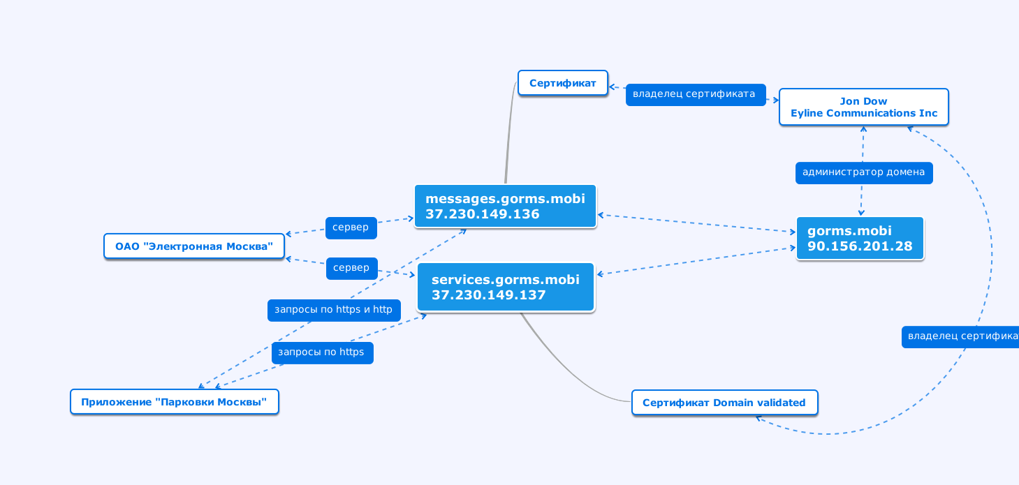 То есть в приложении Парковки Москвы уже не одна потенциальная дыра в безопасности – контроль над прописанными в коде доменами третьего уровня со стороны анонимного лица в США, а две – контроль за сертификатом на один из этих доменов тоже у иностранной компании. Со вторым доменом все тоже не гладко – выданный на него сертификат является так называемым Domain-validated certificate, то есть выдан без установления личности заявителя на основании наличия у заявителя контроля над доменом. Как мы помним, контроль за доменом был у сотрудника Eyeline Communications Inc Андрея Дерябина, а после анонимизации владельца домена находится у Jon Dow, адрес которого подозрительно совпадает с адресом Eyeline Communications Inc.