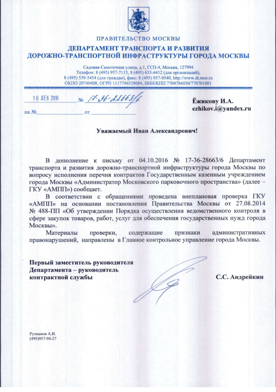 В начале сентября я отправил в Главное контрольное управление жалобу на нарушения Московским паркингом законодательства о госзакупках – они в очередной раз забыли разместить на сайте Госзакупки информацию по уже завершенным контрактам.