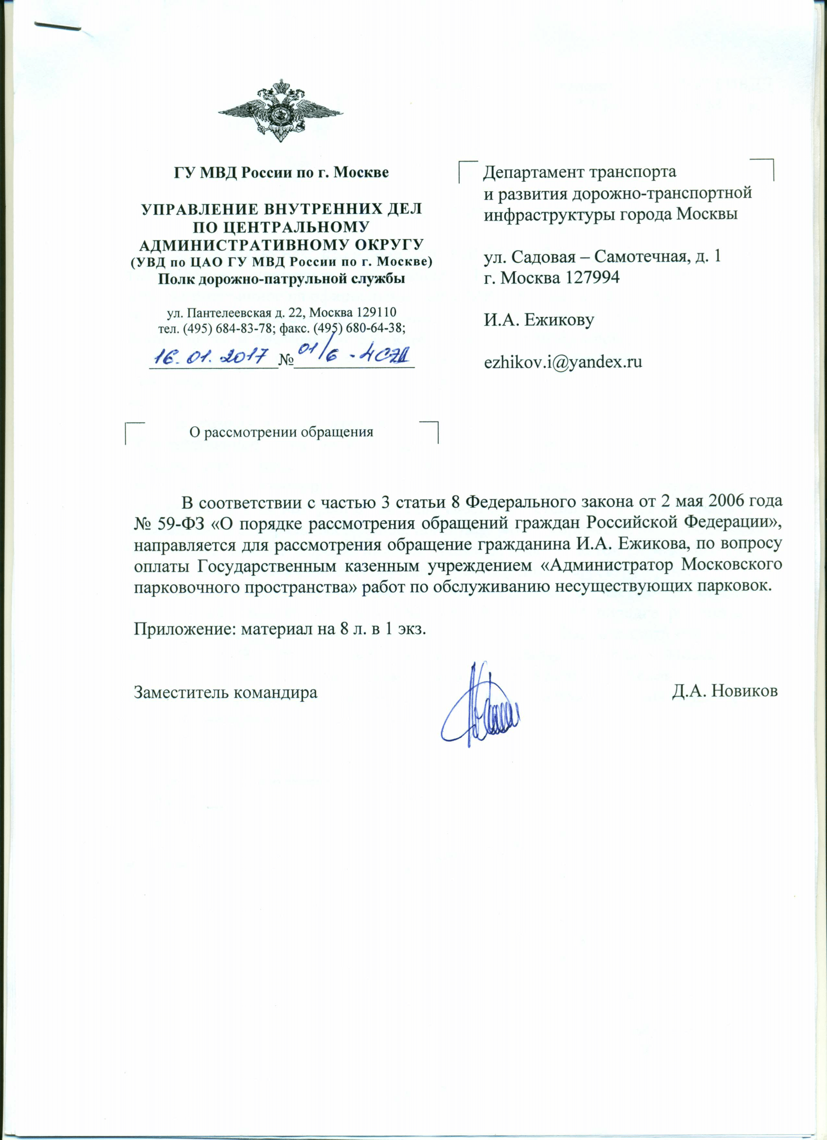 Обалдевшие от празднования Нового года полицейский из ГУВД города Москвы не нашли ничего умнее, чем передать мою жалобу на оплату Московским паркингом обслуживания несуществующих парковок в Полк ДПС УВД Центрального округа… Каким местом они при этом думали – я не понимаю.
